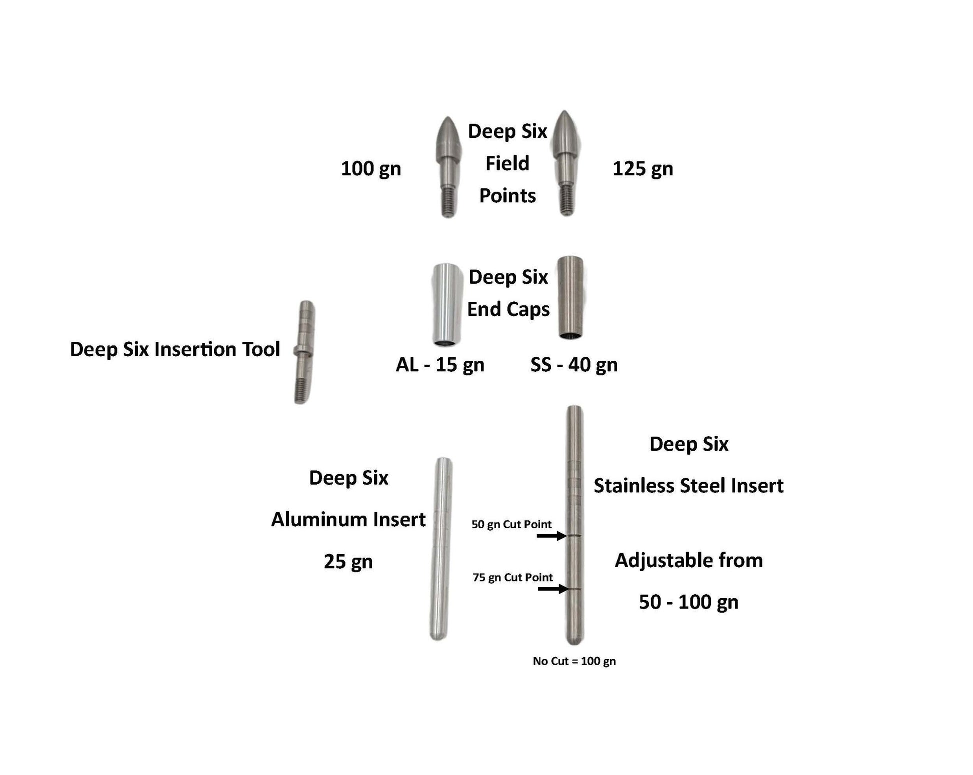 The Easton Deep Six system is the .165 version of the Easton HIT system. It installs the same way as the .204 HIT system, however it is specific to Deep Six field points and broadheads ONLY. Standard points and broadheads will NOT fit. Please ensure you order Deep Six specific field points as well.