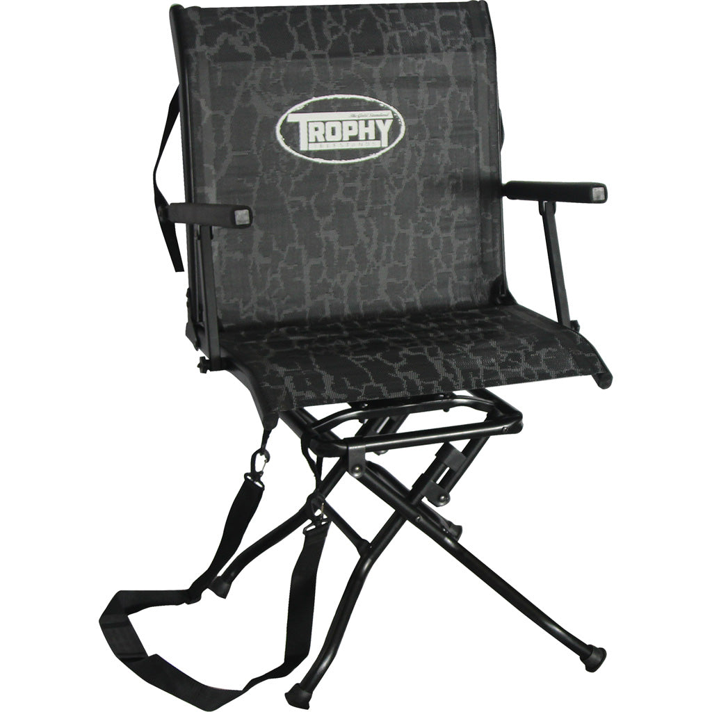 The blind chair has a swivel base, armrest and a built-in bow holder that folds for compact, easy carrying with steel construction weighing 15 lbs.