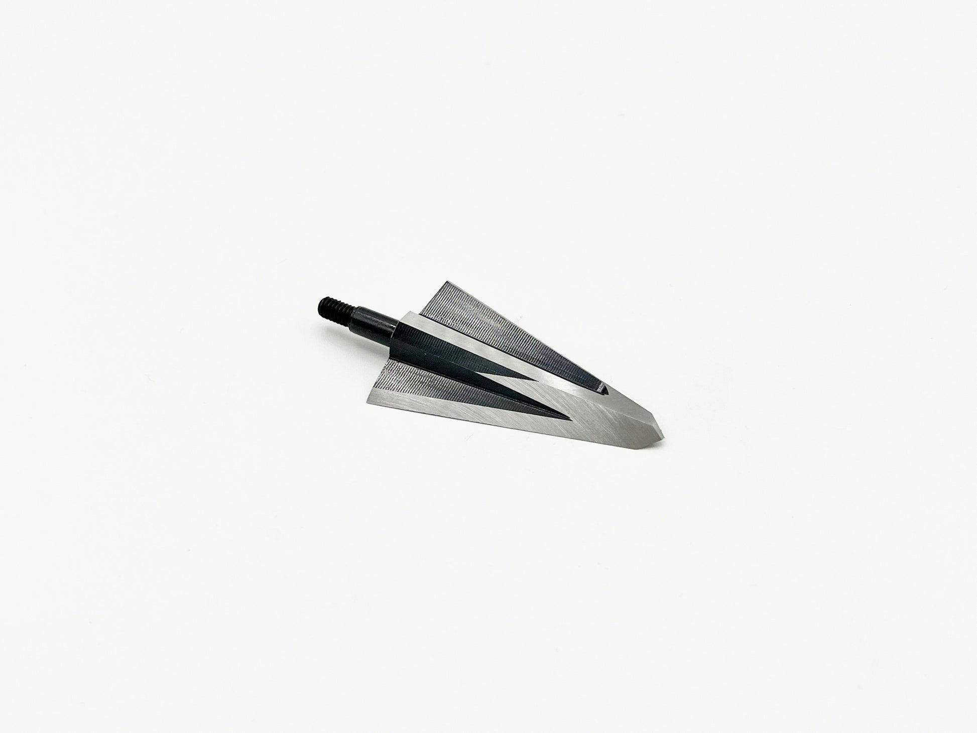 The smoothly integrated ferrule forms a wedge from tip to tail, designed to hold the wound channel open allowing the arrow shaft to pass through without interference. The sharp Tanto tip cuts on contact, time-tested for penetrating meat and bone. Directly following the tip is a massive asymmetric blade section that uniquely combines the bone splitting action of a single bevel broadhead with the inherent toughness of a double bevel broadhead. After the bone begins to split, the mechanical advantage of the wedge-shaped ferrule acting in concert with rotation of the true single bevel blades cause devastating fracturing of the bone. The sharp single bevel blades then slice through arteries and organs like a fine razor, causing massive bleeding and deep penetration.